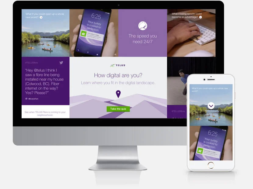 Working collaboratively with the team, we came up with the concept of "Imagine the Possibilities", a celebration of the Internet of Things momentum, with a one-page site filled with consumable and shareable bits of content. We scripted and produced six original 9-second Instagram-inspired videos, created an interactive "How Digital Are You?" quiz with illustrated characters, and compiled social media quotes, facts and Telus Fibre story content all into a scalable, mobile-friendly package.